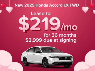 Ex: New 2025 Honda Accord LX FWD 4dr Sedan CVT 1.5L. $219 per month for 36 months. With approved credit. 10,000 miles per year. $3,999 due at signing. Security deposit not required. Closed-end lease available through 03/02/2026 to approved lessees or purchasers by Honda Financial Services in select states only. Advertised Price EXCLUDES all optional dealer offered items, accessories, or product addendums optionally selected by the purchaser and applicable governmental official taxes and fees and GA lemon law fees. See dealer for details. Offer expires 03/02/2026.