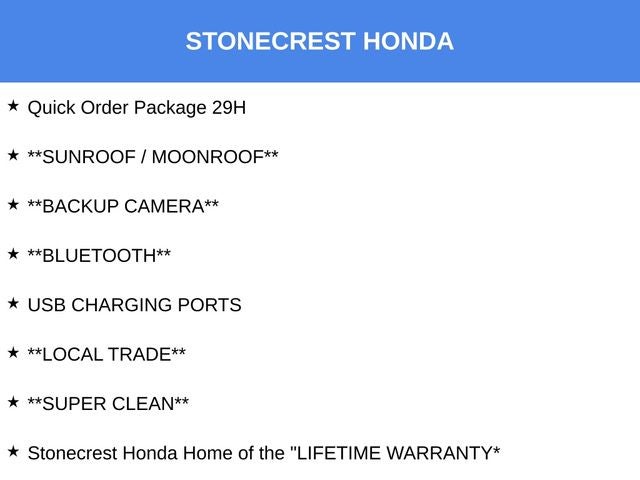 **SUNROOF / MOONROOF**, **BACKUP CAMERA**, **Bluetooth®**, USB CHARGING PORTS, **LOCAL TRADE**, **SUPER CLEAN**, Stonecrest Honda Home of the LIFETIME WARRANTY*, **CUSTOM WHEELS**, **LOW MILES**, **Push-Button START!**, 1-Yr SiriusXM Guardian Trial, 2-Piece Shark Fin Antenna, 4G LTE Wi-Fi Hot Spot, ABS brakes, Air Conditioning, Alloy wheels, AM/FM radio: SiriusXM, Apple CarPlay, Apple CarPlay/Android Auto, Auto-dimming Rear-View mirror, Automatic temperature control, Brake assist, Compass, Delay-off headlights, Dual front impact airbags, Dual front side impact airbags, Electronic Stability Control, Emergency communication system: SiriusXM Guardian, Four wheel independent suspension, Front dual zone A/C, Fully automatic headlights, Garage door transmitter: HomeLink, Google Android Auto, GPS Antenna Input, HD Radio, Illuminated entry, Integrated Center Stack Radio, Integrated Voice Command w/Bluetooth®, Leather Shift Knob, Manufacturer's Statement of Origin, Media Hub (2 USB, AUX), Panic alarm, ParkView Rear Back-Up Camera, Power 2-Way Driver Lumbar Adjust, Power 8-Way Driver Seat, Power door mirrors, Power driver seat, Power windows, Quick Order Package 29H, Rear Armrest w/Cupholder Seat, Remote keyless entry, Speed control, Speed-Sensitive Wipers, Spoiler, Steering wheel mounted audio controls, Variably intermittent wipers, Wheels: 20 x 8 Carbon AWD. CARFAX One-Owner. 18/27 City/Highway MPG