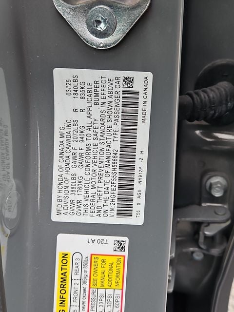 ABS brakes, Adaptive Cruise Control: Adaptive Cruise Control (ACC) with Low-Speed Follow, Air Conditioning, Alloy wheels, AM/FM radio, Apple CarPlay/Android Auto, Auto High-beam Headlights, Automatic temperature control, Blind Spot Information (BSI) System warning, Brake assist, Delay-off headlights, Dual front impact airbags, Dual front side impact airbags, Electronic Stability Control, Emergency communication system: HondaLink, Exterior Parking Camera Rear, Front reading lights, Fully automatic headlights, Heated door mirrors, Illuminated entry, Leather Shift Knob, Leather steering wheel, Outside temperature display, Panic alarm, Power door mirrors, Power windows, Radio data system, Radio: 180-Watt Audio System, Remote keyless entry, Security system, Speed control, Speed-sensing steering, Steering wheel mounted audio controls, Traction control, Wheels: 18 Gloss Black Alloy, 4-Wheel Disc Brakes, 8 Speakers, Bumpers: body-color, Cloth/Leatherette Seating Surfaces, Driver door bin, Driver vanity mirror, Four wheel independent suspension, Front anti-roll bar, Front Bucket Seats, Front Center Armrest, Knee airbag, Low tire pressure warning, Occupant sensing airbag, Overhead airbag, Passenger door bin, Passenger vanity mirror, Power steering, Rear anti-roll bar, Rear seat center armrest, Rear side impact airbag, Rear window defroster, Split folding rear seat, Tachometer, Telescoping steering wheel, Tilt steering wheel, and Trip computer.